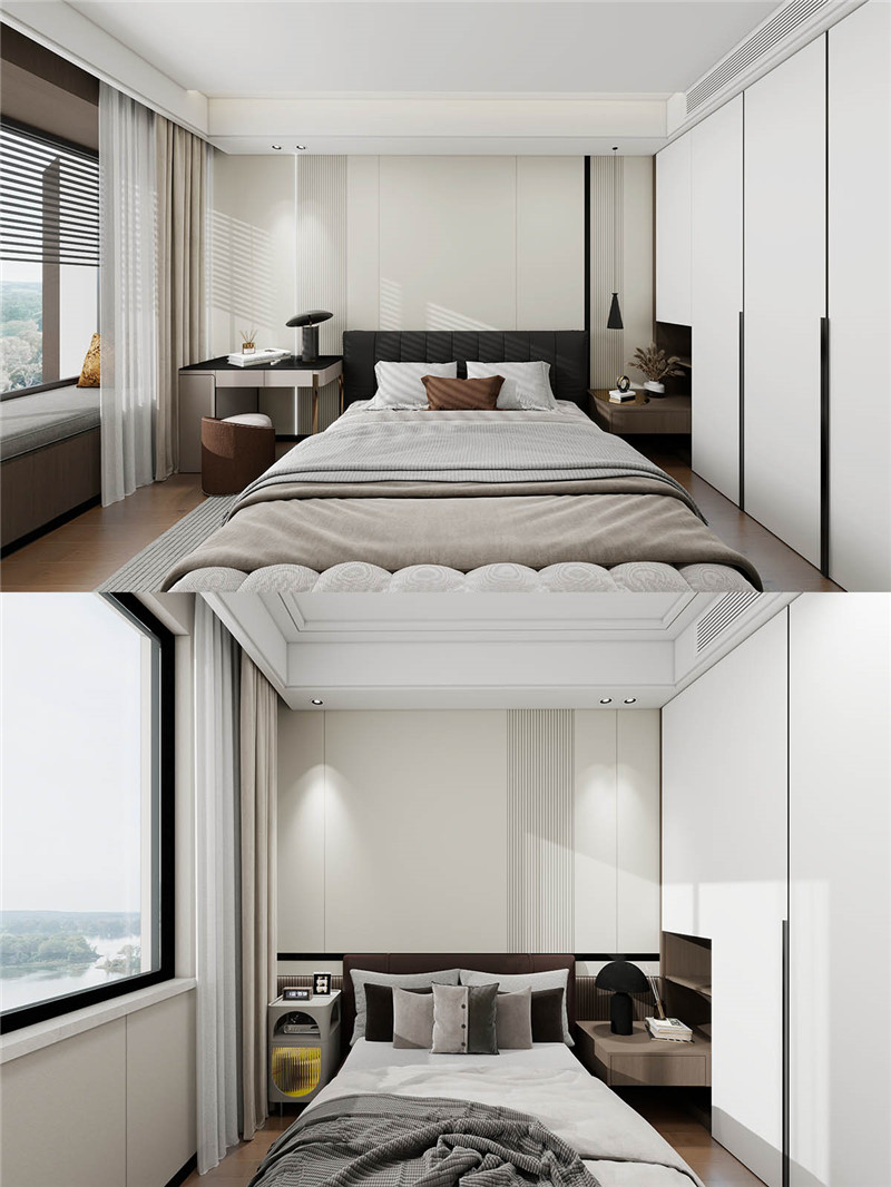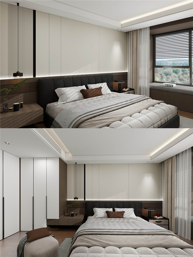主卧巧妙利用飘窗实现休憩与收纳一体化,延展空间价值。次卧采用墙柜一体设计,简约整体化,提升空间利用率,营造安稳舒适的睡眠环境。