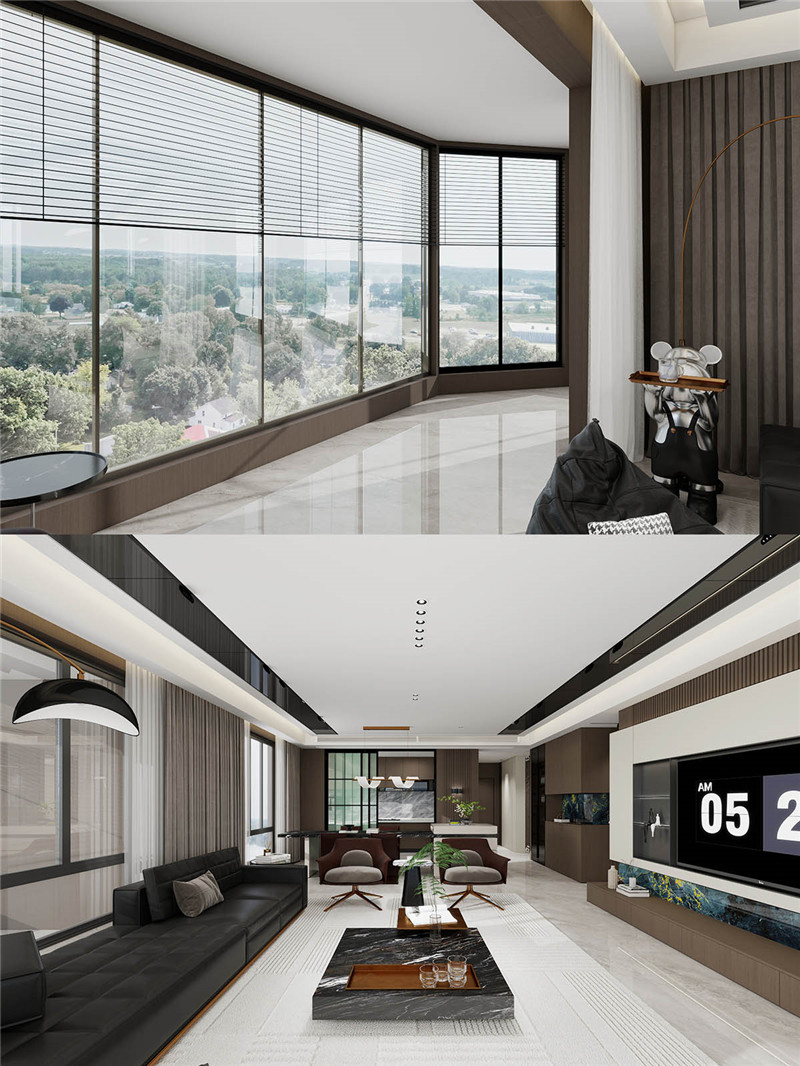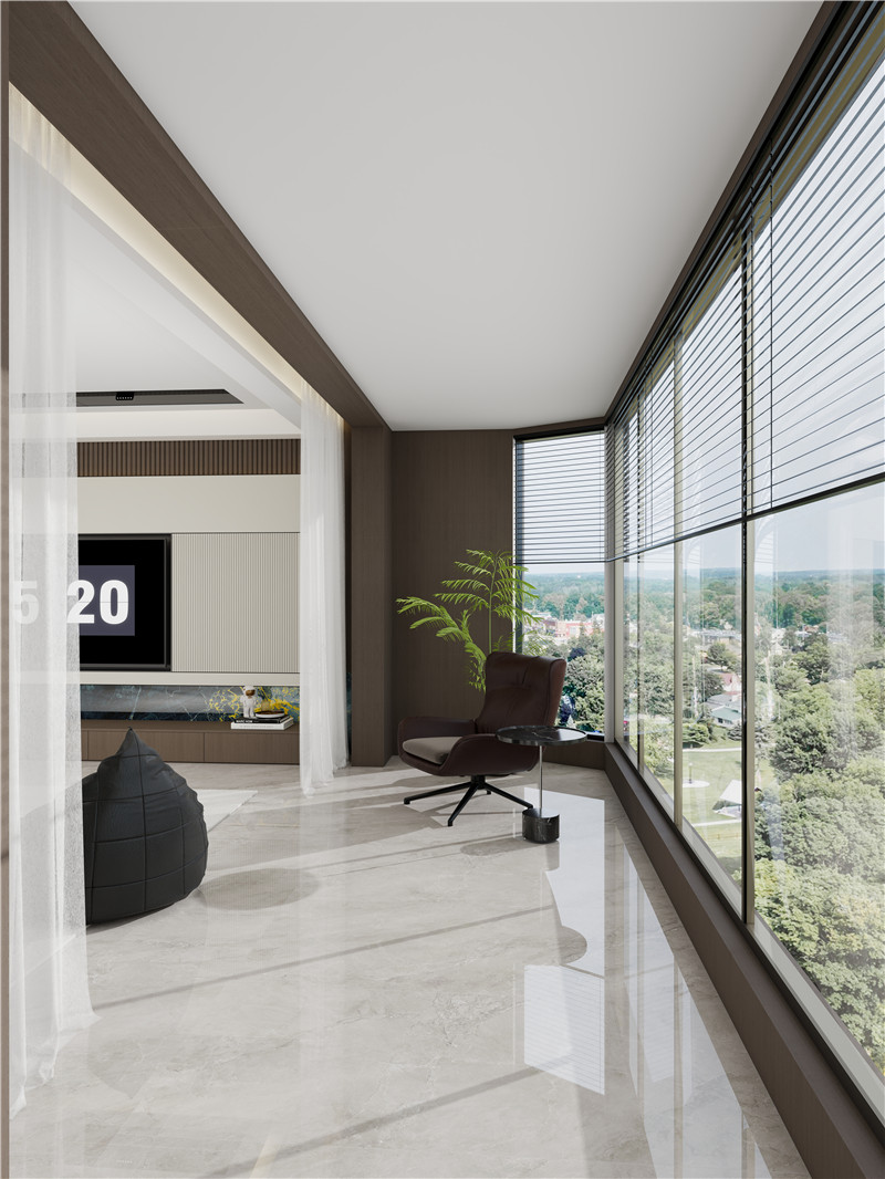 超大环绕式阳台将自然光与风景无缝接入室内,与满墙电视柜相呼应。电视墙以蓝金大理石纹局部点缀,轻奢质感悄然流露,成为视觉焦点。