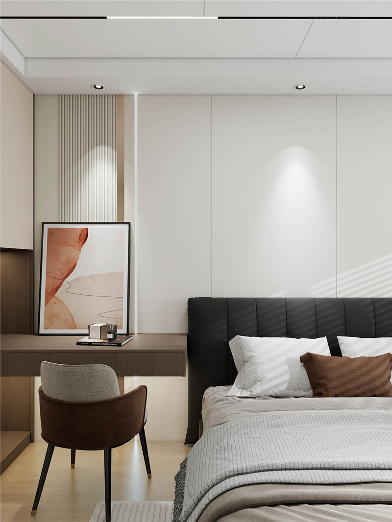 延续轻奢格调,飘窗造型柔和光影。定制衣柜转角延伸为书桌,一隅安静,兼顾办公与梳妆。